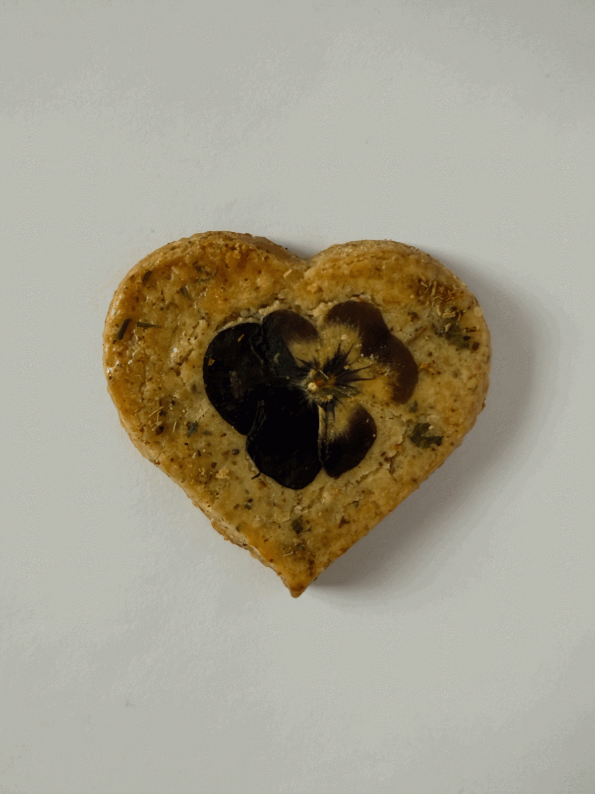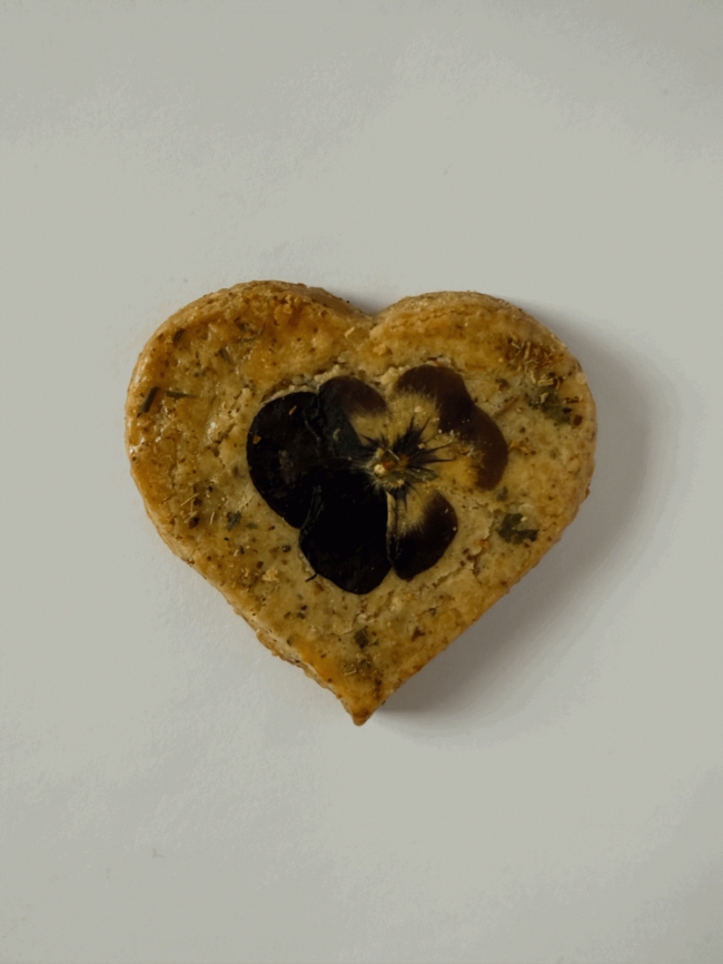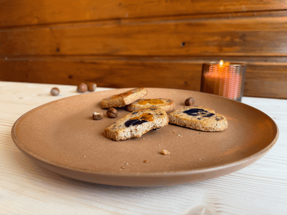 Ingrédients naturels : farine fleur, beurre, sucre, noisettes moulues, œuf, sel, herbes et fleurs comestibles.